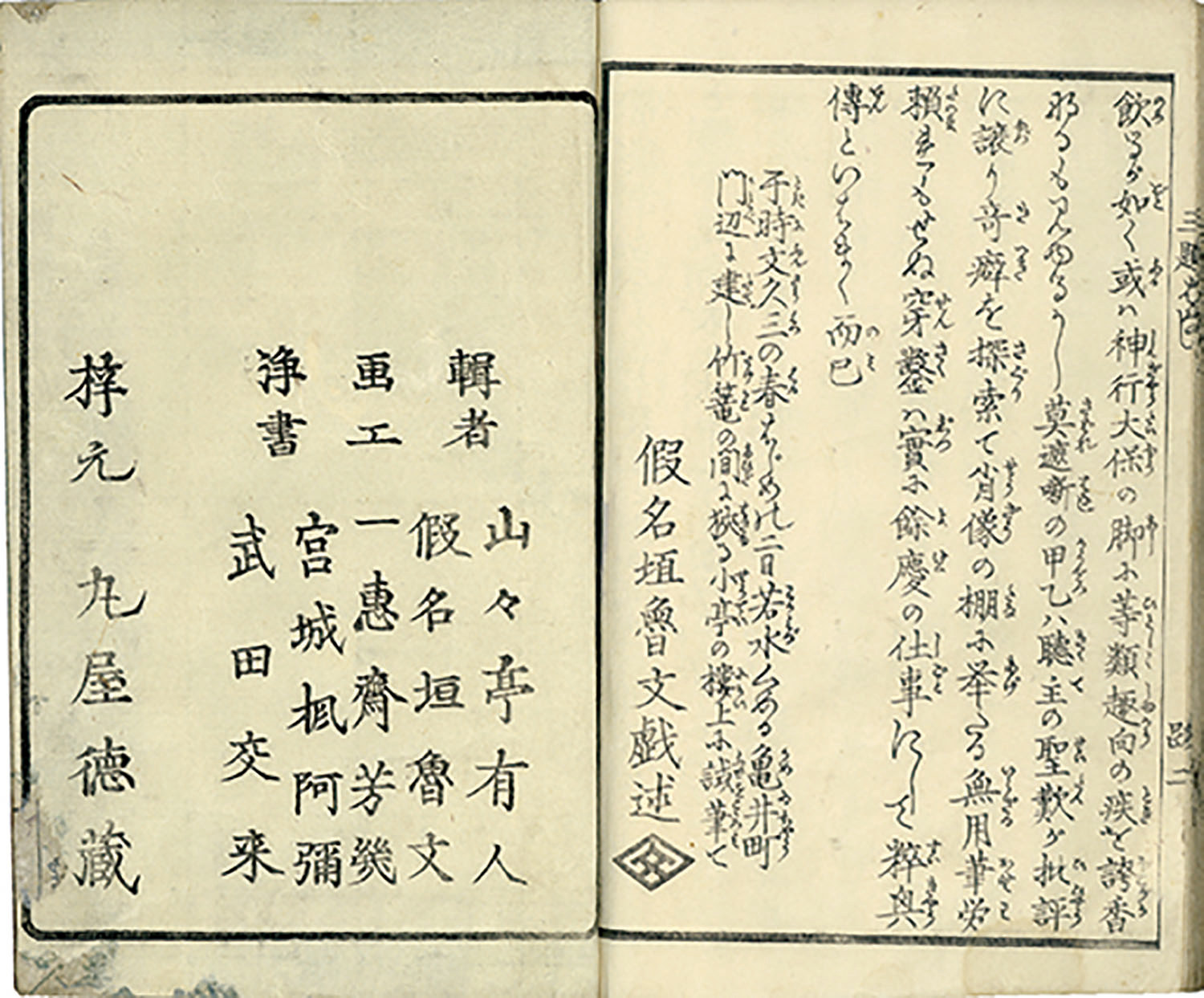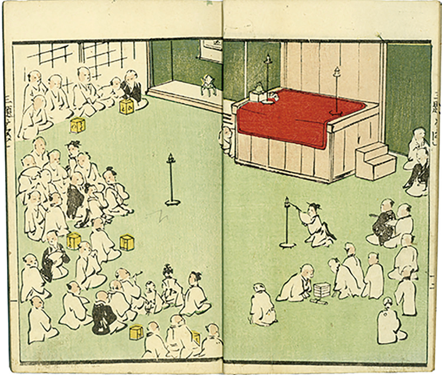 丸屋徳蔵板 中本18×11.7糎 〔柱書〕三題はなし 題簽欠 瀬川如皐、河竹其水、山閑人交来、梅素玄魚、文桂舎栄寿、立川談志、三遊亭圓朝他肖像入