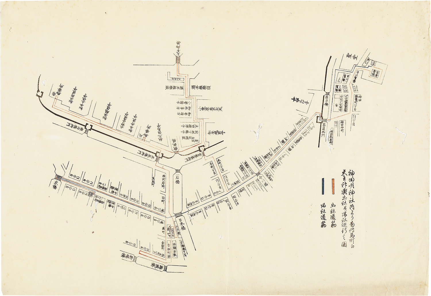 「神田明神社内より南傳馬町江天王神輿出社并帰社巡行之図」
