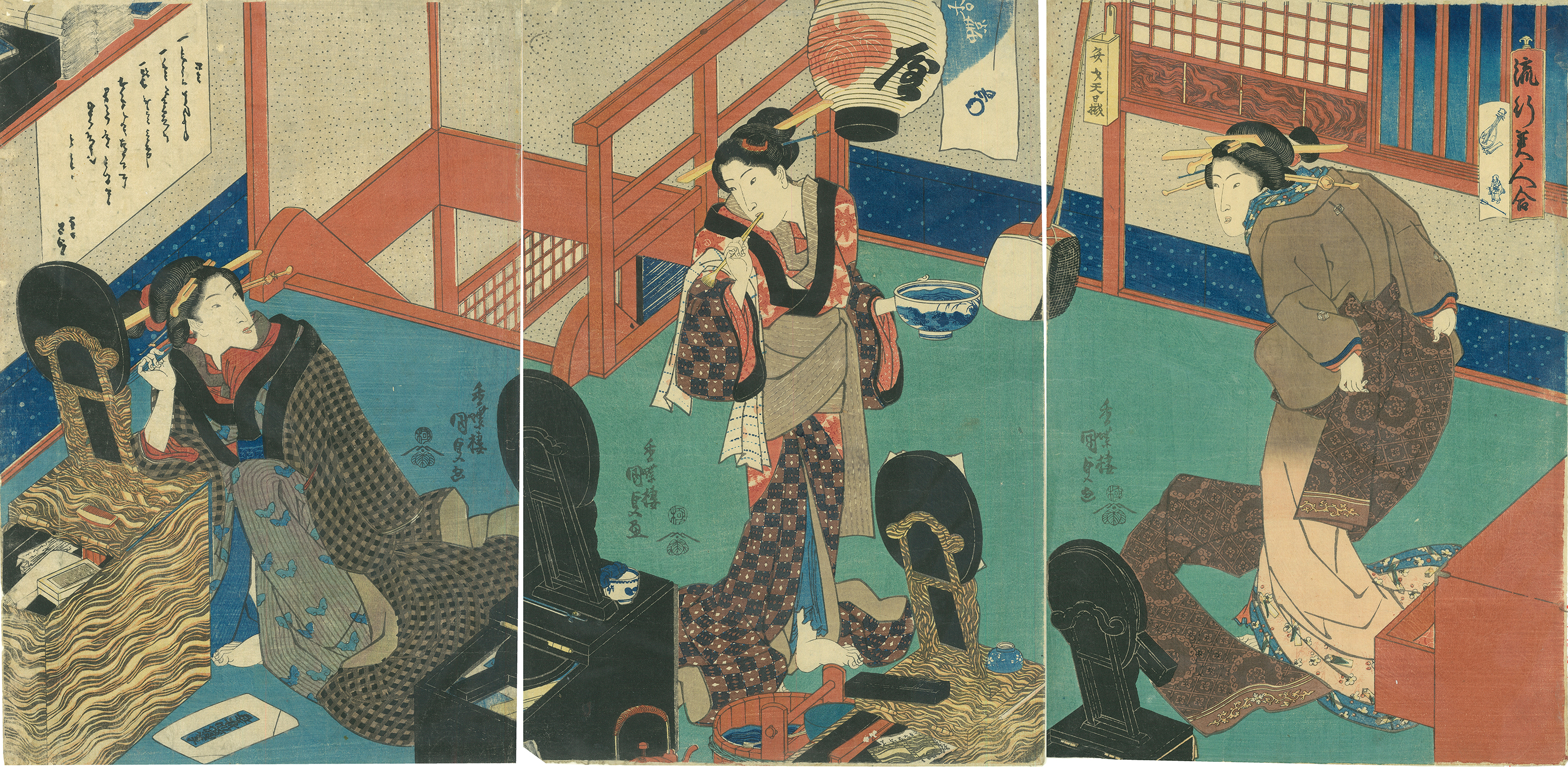 化粧する三婦女 蔦屋吉蔵板 3枚続