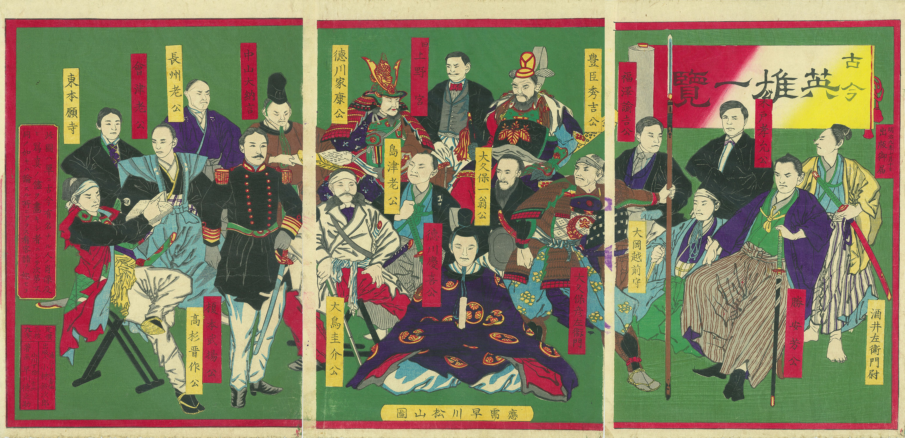 小林鉄次郎板 福澤諭吉 徳川家康 慶喜 豊臣秀吉 高杉晋作 勝安芳他 大判錦絵3枚続
