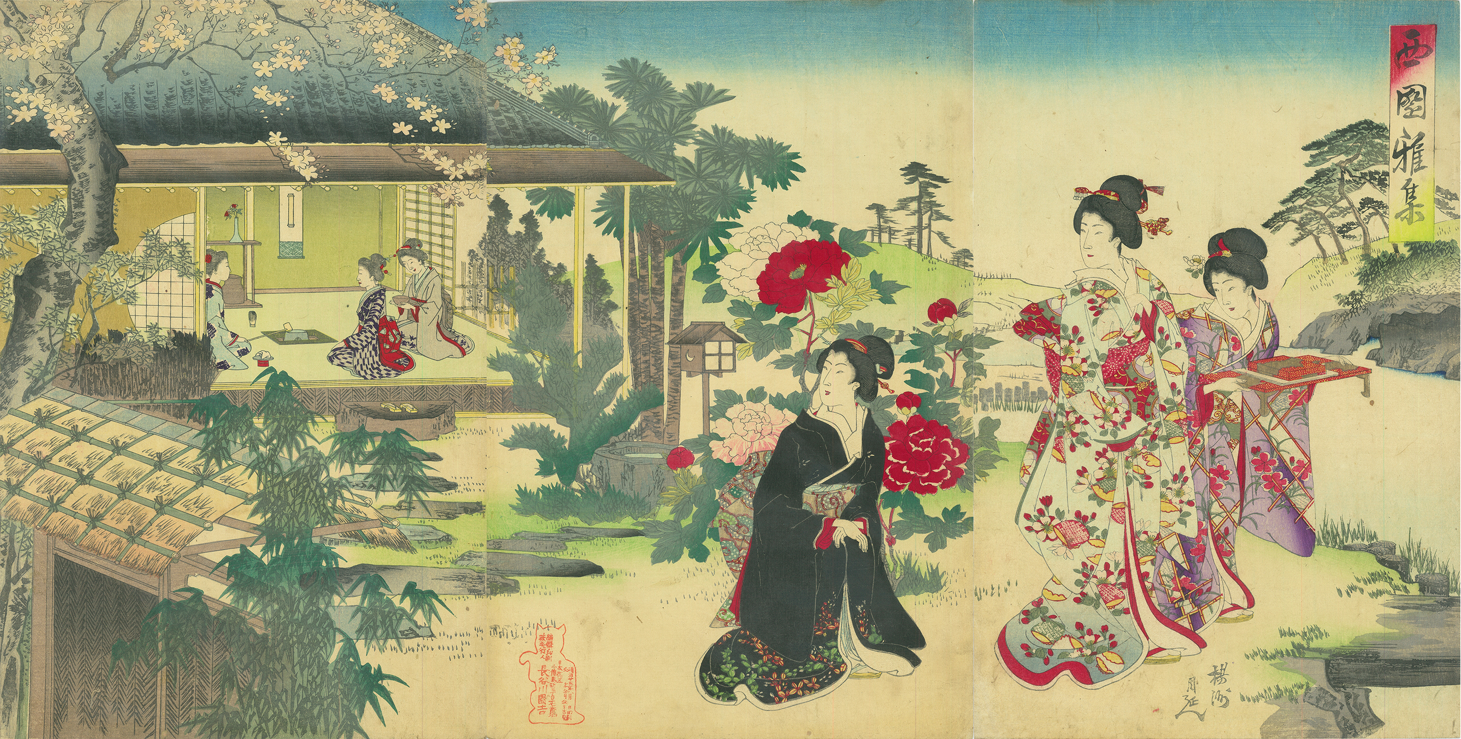 Published by Hasegawa Sonokichi, o-ban Nishiki-e, 35.9×70.9cm, backed, 3 pieces